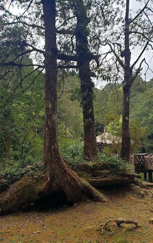 As we were now entering the land of the giants, it was good to learn a bit about how the cypress trees fuse into gigantic forms.We followed signage on the Giant Tree Trail Boardwalk for the Xianglin Sacred Tree. It led us across a small suspension bridge and then to a small shrine with a tree with hollowed out roots next to it.