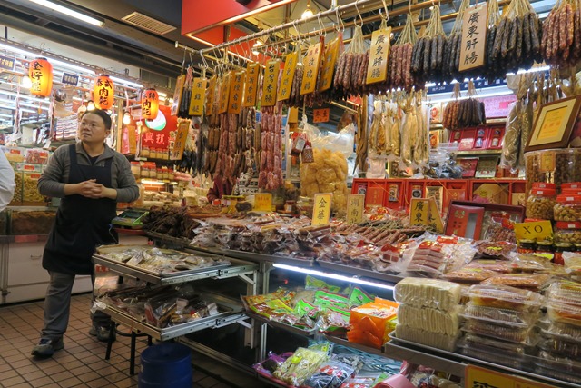 Stall in Nanhai Market selling chinese sausages and dried food.